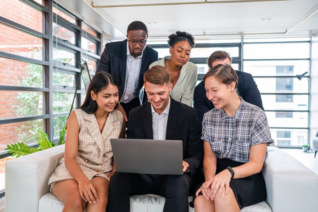 International professional business team people using laptop standing in office. Busy diverse workers group looking at computer discussing digital technology corporate strategy in teamwork at office